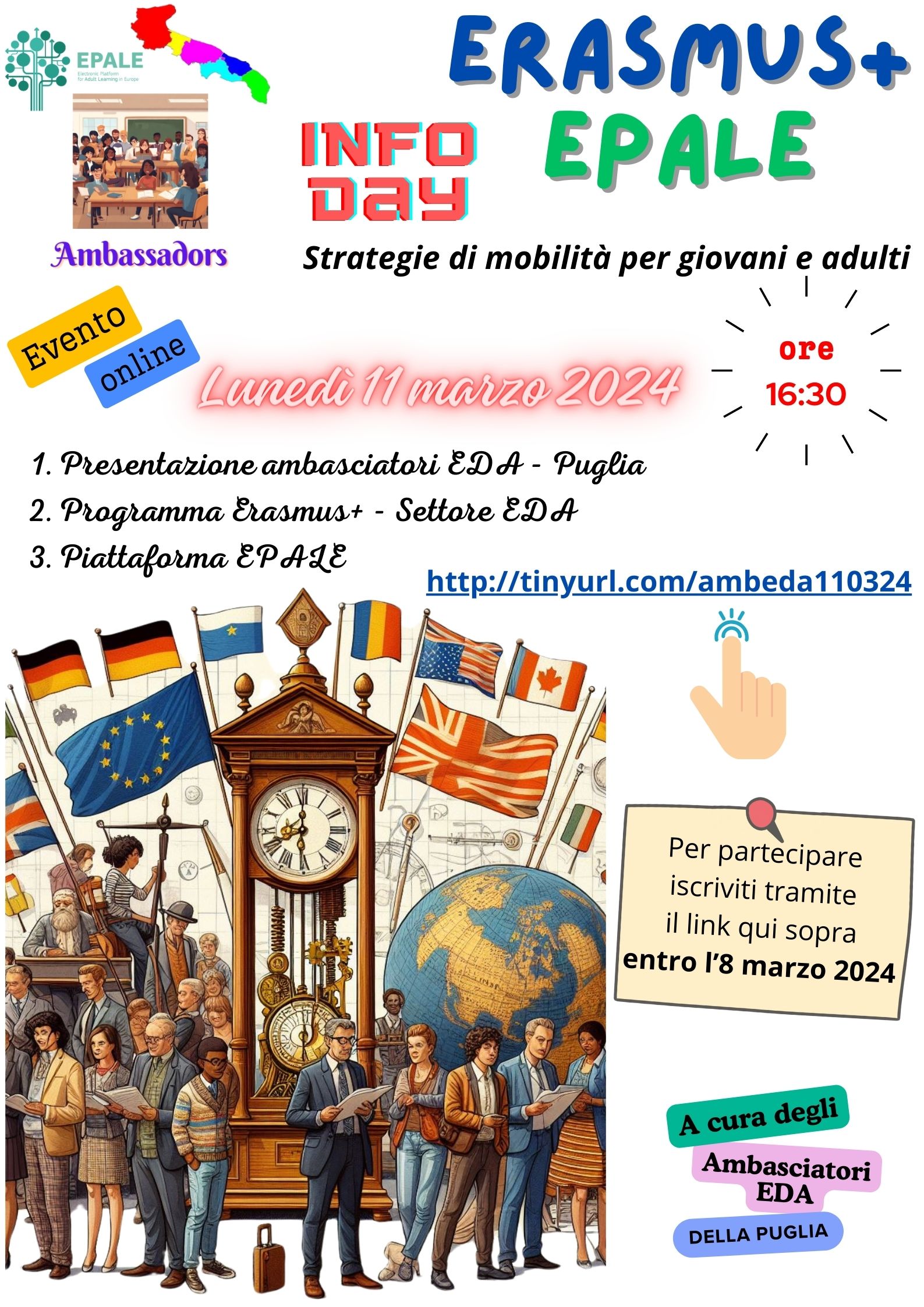 Gli Ambasciatori/trici Erasmus+/EDA della Regione Puglia organizzano due incontri online, nel mese di marzo 2024, per scoprire le opportunità europee che il Programma Erasmus+ mette a disposizione dei professionisti che si occupano dell’educazione degli adulti, affinché essi possano facilmente orientarsi nella scelta dell’esperienza più adatta a ogni persona e organizzazione, e per individuare gli elementi importanti per scrivere una proposta di qualità aderente agli obiettivi del Programma.