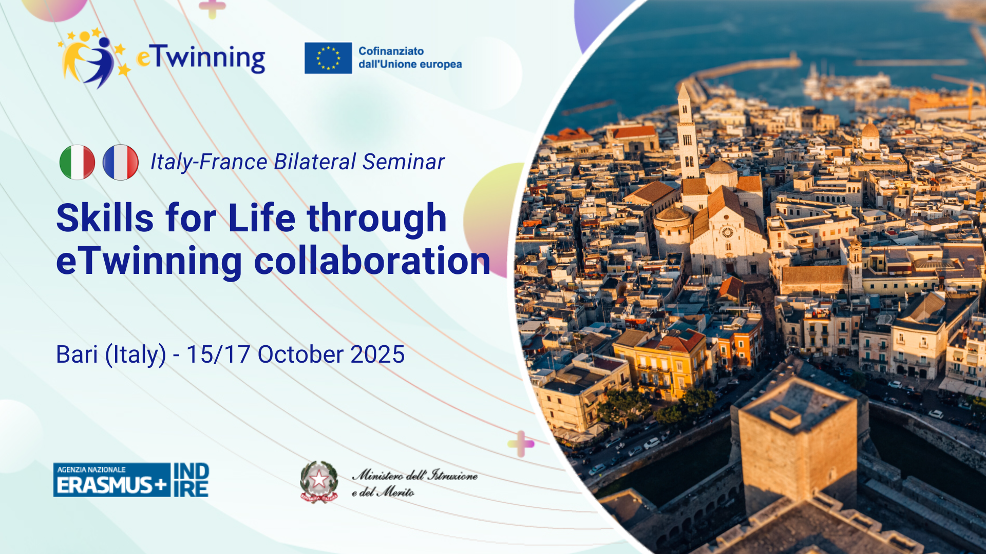 L’Unità nazionale eTwinning Italia in collaborazione con l’Unità francese organizza a Bari, dal 15 al 17 ottobre 2025, un seminario bilaterale dal titolo: “Italy–France Bilateral Seminar 2025: Skills for Life through eTwinning collaboration”. L’evento è dedicato a docenti di scuola secondaria di I grado (alunni 11-13 anni), principianti in eTwinning.