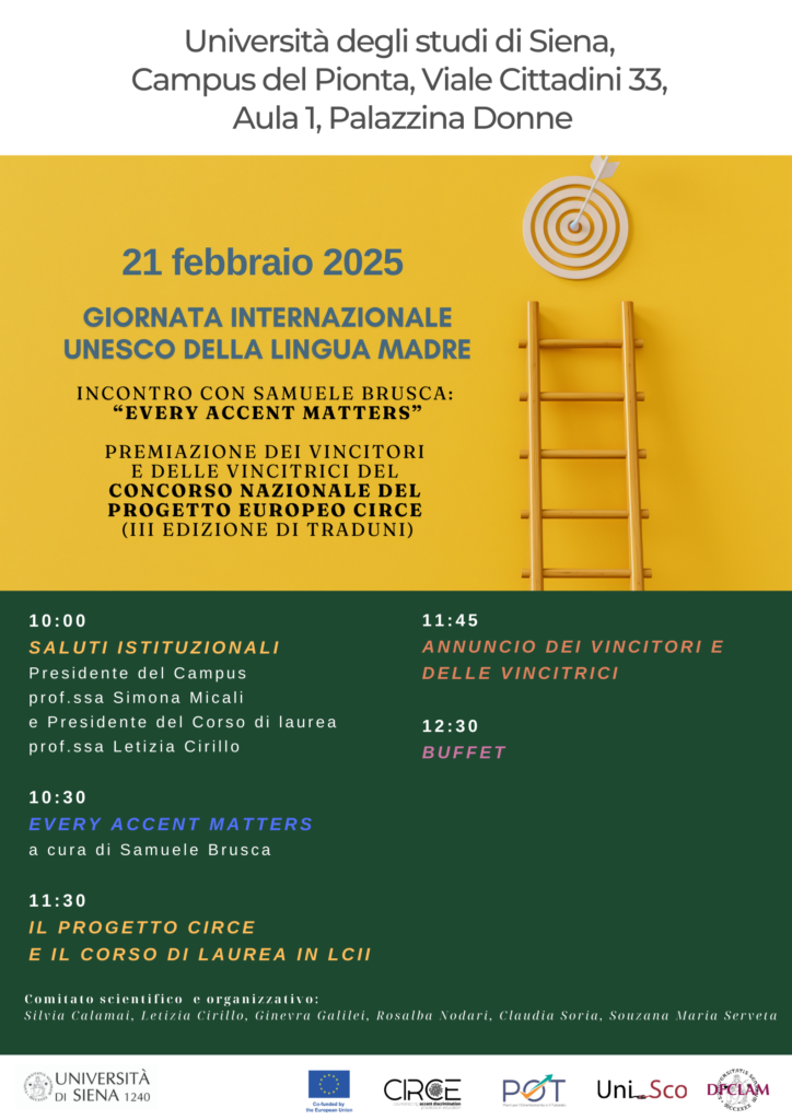 In occasione della Giornata Unesco della lingua madre, il 21 febbraio ad Arezzo, presso il Campus del Pionta dell’Università degli studi di Siena, si terrà la premiazione dei vincitori e delle vincitrici italiane del concorso di scrittura e del concorso video sul tema del razzismo sonoro e della discriminazione linguistica, ideato dal progetto ERASMUS+ CIRCE.
