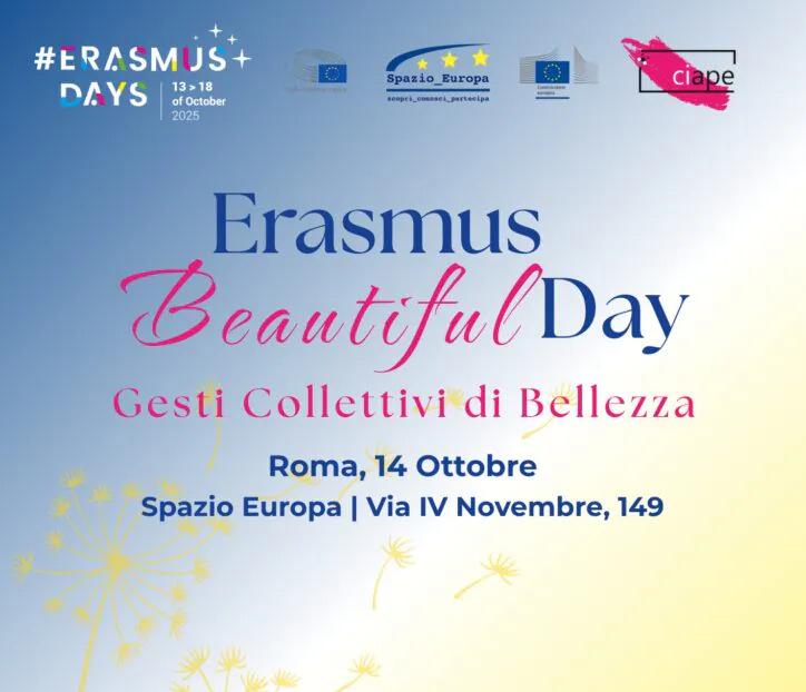 L’Erasmus Beautiful Day 2025 a cura di CIAPE in programma a Roma il 14 ottobre nasce con l’intento di diventare un gesto collettivo di bellezza, in uno spazio in cui la bellezza educativa non viene solo celebrata, ma condivisa e diffusa riunendo tre anime profonde:
