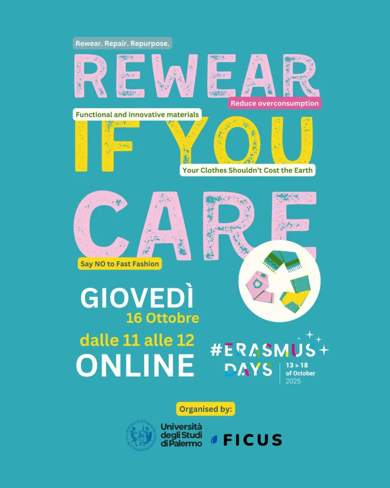Il 16 ottobre FICUS ETS di Palermo propone la mattina un incontro online aperto a tutti dal titolo ReWear If You Care – Fashion, Technology and Sustainability e il pomeriggio un incontro porte aperte presso la propria sede Eco Aperitivo da Ficus in occasione degli ErasmusDays. In collaborazione con Arcadia Fumetti di Palermo, il 18 ottobre organizza inoltre Board Game Afternoon un pomeriggio per giovani e adulti dai 15 ai 70 anni, per sviluppare competenze trasversali e sperimentare attività di gamification.