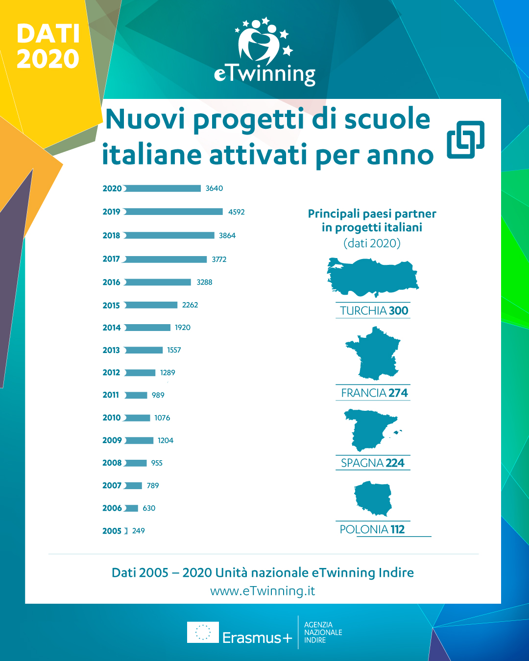 Nel 2020 circa il 50% dei progetti eTwinning di insegnanti di istituti italiani sono stati attivati con scuole di Turchia, Francia, Spagna e Polonia.