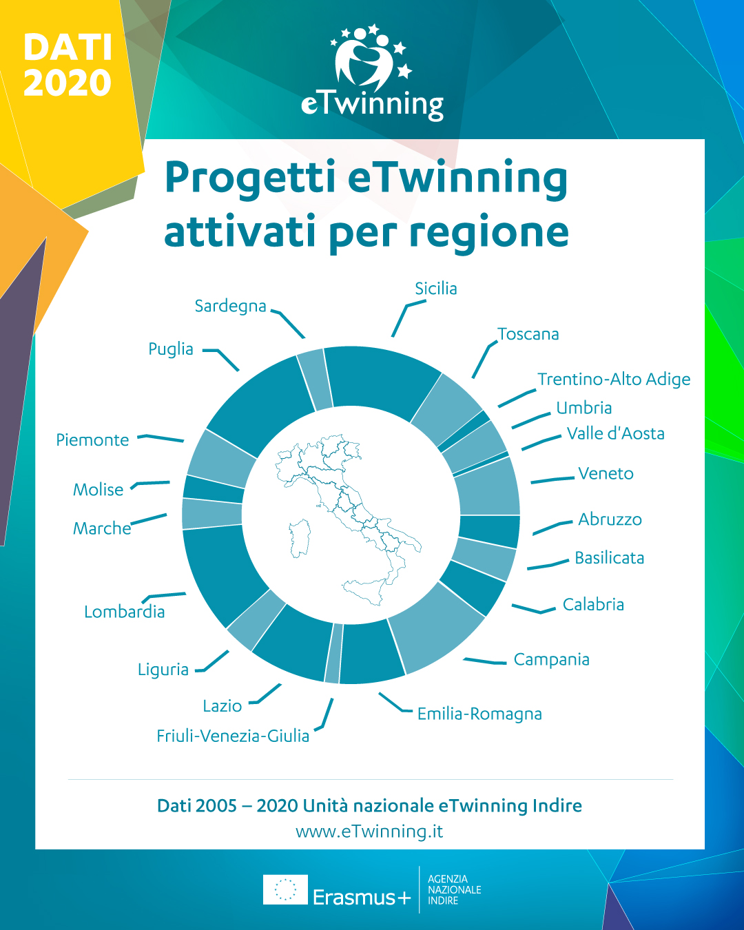 Quanto agli insegnanti registrati a livello locale, nel 2020 le regioni che hanno visto più adesioni a eTwinning sono state Piemonte (2100 nuovi docenti registrati), Campania e Lombardia. Rispetto al numero di progetti attivati nell’anno il gradino più alto del podio va alla Sicilia, con 677 nuove collaborazioni attivate, seguita da Campania e Puglia.