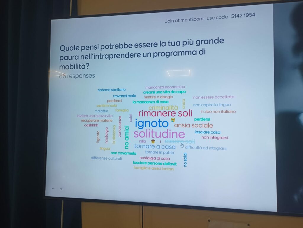 Domenico Denis Angarano, Alumnus e tesoriere di Erasmus Student Network Trieste e Sub-Coordinatore della Causa Social Inclusion di ESN Italia, ha coinvolto i ragazzi in un braimstorming interattivo, attraverso il quale i presenti hanno espresso i loro pareri sul tema delle aspettative, speranze e paure in merito alla possibilità di partire per un progetto di Mobilità in un altro Paese europeo.