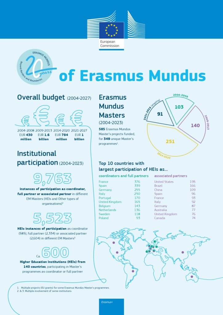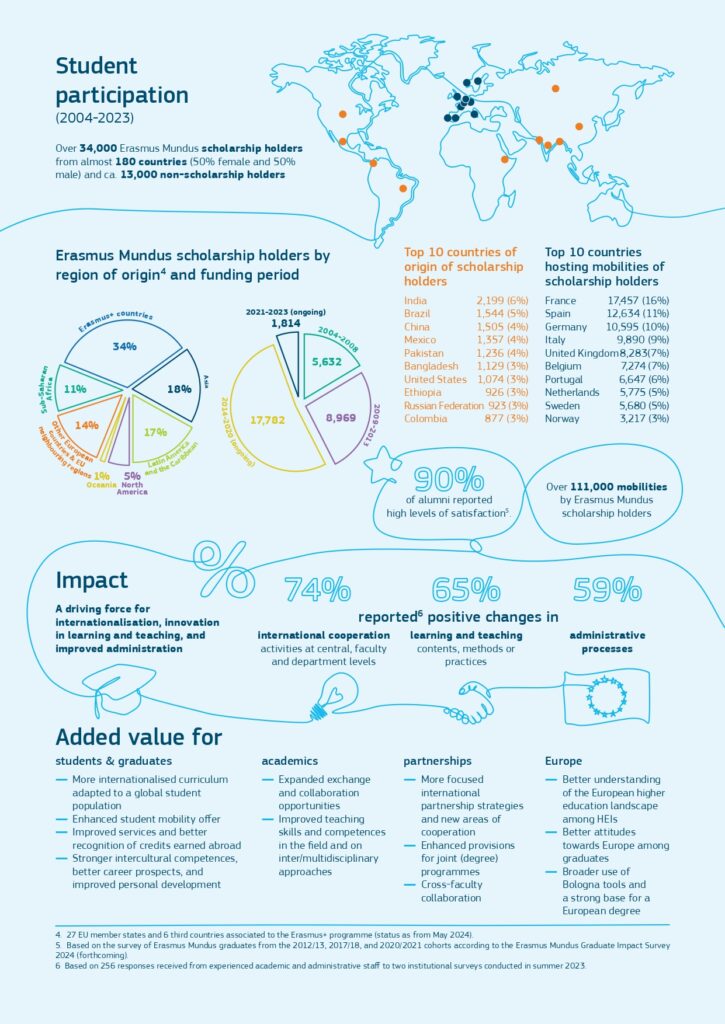 In vista di questo anniversario, l’Agenzia esecutiva europea per l’istruzione e la cultura (EACEA) ha pubblicato lo studio 20 anni di Erasmus Mundus: impatto trasformativo e percorsi per il futuro. Lo studio evidenzia gli effetti trasformativi di Erasmus Mundus sugli individui, sugli istituti di istruzione superiore e sui Paesi all’interno e all’esterno dell’Unione Europea. L’indagine evidenzia inoltre come e quanto, in 20 anni, Erasmus Mundus abbia rafforzato la qualità dell’istruzione e la collaborazione internazionale negli istituti di istruzione superiore in Europa e oltre. Dalla sua creazione, quasi 50.000 studenti provenienti da 179 paesi hanno partecipato ai master Erasmus Mundus e più di 34.000 studenti hanno ricevuto una borsa di studio dell’UE.
