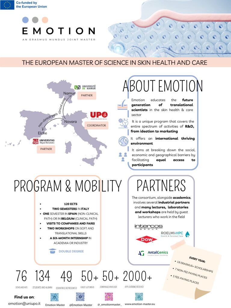 Il Master europeo in salute e cura della pelle EMOTION educa la futura generazione di scienziati e professionisti nella salute e nella cura della pelle e li equipaggia con le conoscenze e le competenze per lavorare nella ricerca e sviluppo e contribuire alla concezione e allo sviluppo di cosmetici innovativi, farmaci dermatologici e dispositivi medici. Il Master copre l’intero spettro di attività, dall’ideazione al marketing, dalla creazione di un’azienda alla sorveglianza post-marketing. Benessere, diversità, inclusione, cooperazione, condivisione, comunicazione, imprenditorialità ed eccellenza sono le parole chiave del programma. EMOTION è un programma di 120 ECTS di 2 anni che rilascia una doppia laurea, dall’Università del Piemonte Orientale e dall’Università Miguel Hernández o dall’Università di Namur. Ogni anno sono disponibili 30 posti (18 con borse di studio, 7 a pagamento e 5 a pagamento autofinanziati). Il primo anno del Master è trascorso in Italia studiando la scoperta in fase iniziale. Nel secondo anno, gli studenti scelgono di andare in Spagna per studiare ricerca e sviluppo non clinico o di andare in Belgio per studiare lo sviluppo clinico. Nell’ultimo semestre, lo studente intraprende uno stage, che può essere nell’industria o nel mondo accademico in qualsiasi parte del mondo. Il consorzio, insieme a un elenco di accademici esperti, coinvolge anche una serie di partner associati industriali e molte lezioni sono tenute da docenti ospiti che lavorano nel campo. Tre workshop dedicati sono organizzati in ogni assunzione e sono incluse anche visite ad aziende e fiere. Il programma si traduce in una rete consolidata e internazionale di attori accademici e non educativi che cooperano per sviluppare prodotti innovativi di grado farmaceutico, cosmetico e dispositivo per il benessere della pelle.