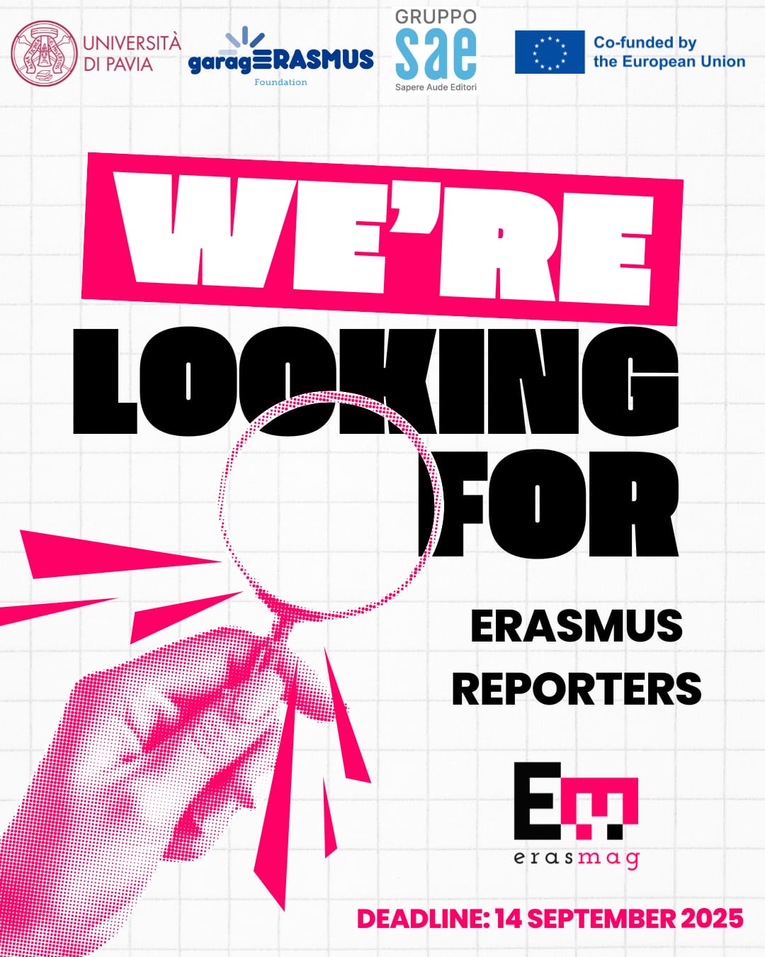 ErasMAG è un progetto promosso dalla Fondazione garagErasmus, in collaborazione con il gruppo editoriale Gruppo SAE. L’Agenzia nazionale Erasmus+ INDIRE sostiene il progetto e la valorizzazione e diffusione dello stesso.