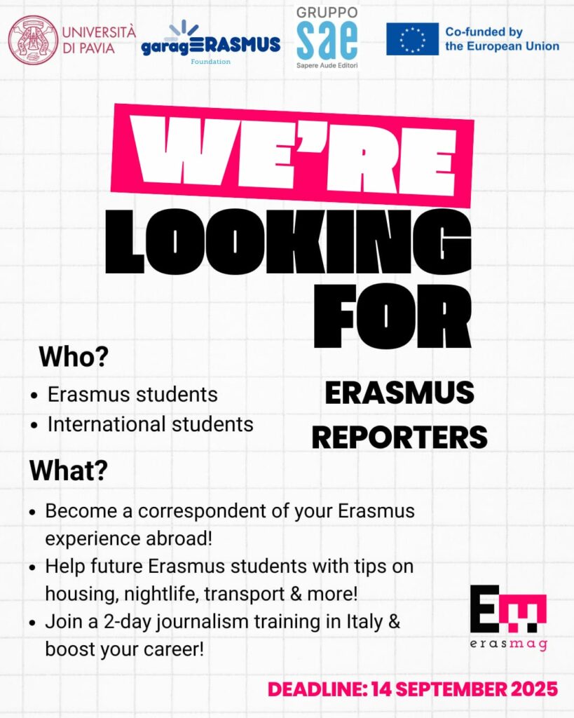 Si avvia ora la selezione dei Reporter per il semestre Ottobre 2025 – Febbraio 2026: sono invitati a candidarsi tutti gli studenti Erasmus+ outgoing ed incoming del primo semestre e gli studenti internazionali presenti negli atenei italiani.