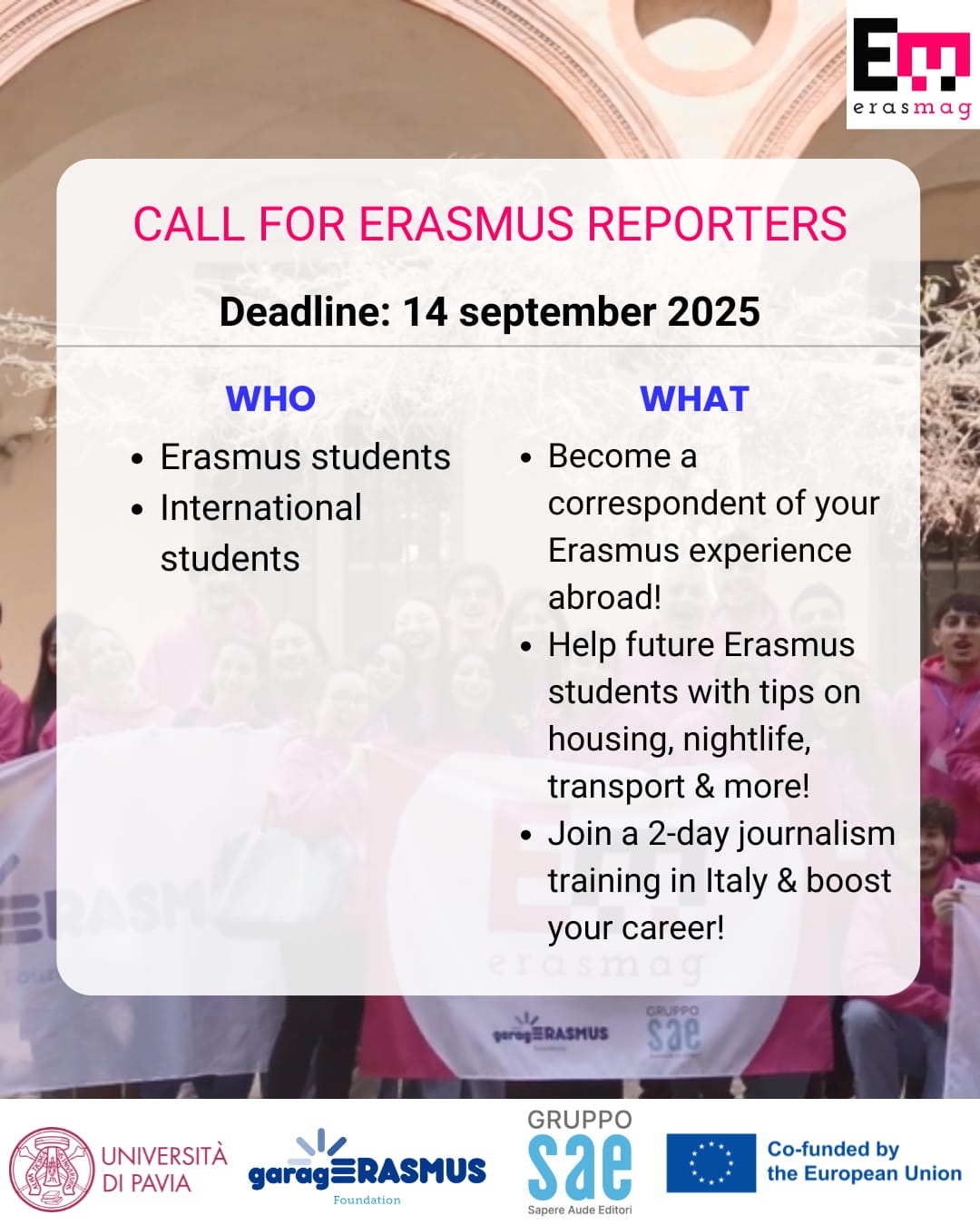 L’obiettivo di ErasMag è, da un lato, di mettere in luce le esperienze di mobilità ed la cooperazione internazionale in ambito istruzione superiore, dall’altro offrire l’opportunità agli studenti incoming ed outgoing di collaborare come giornalisti, coordinati da professionisti di settore.