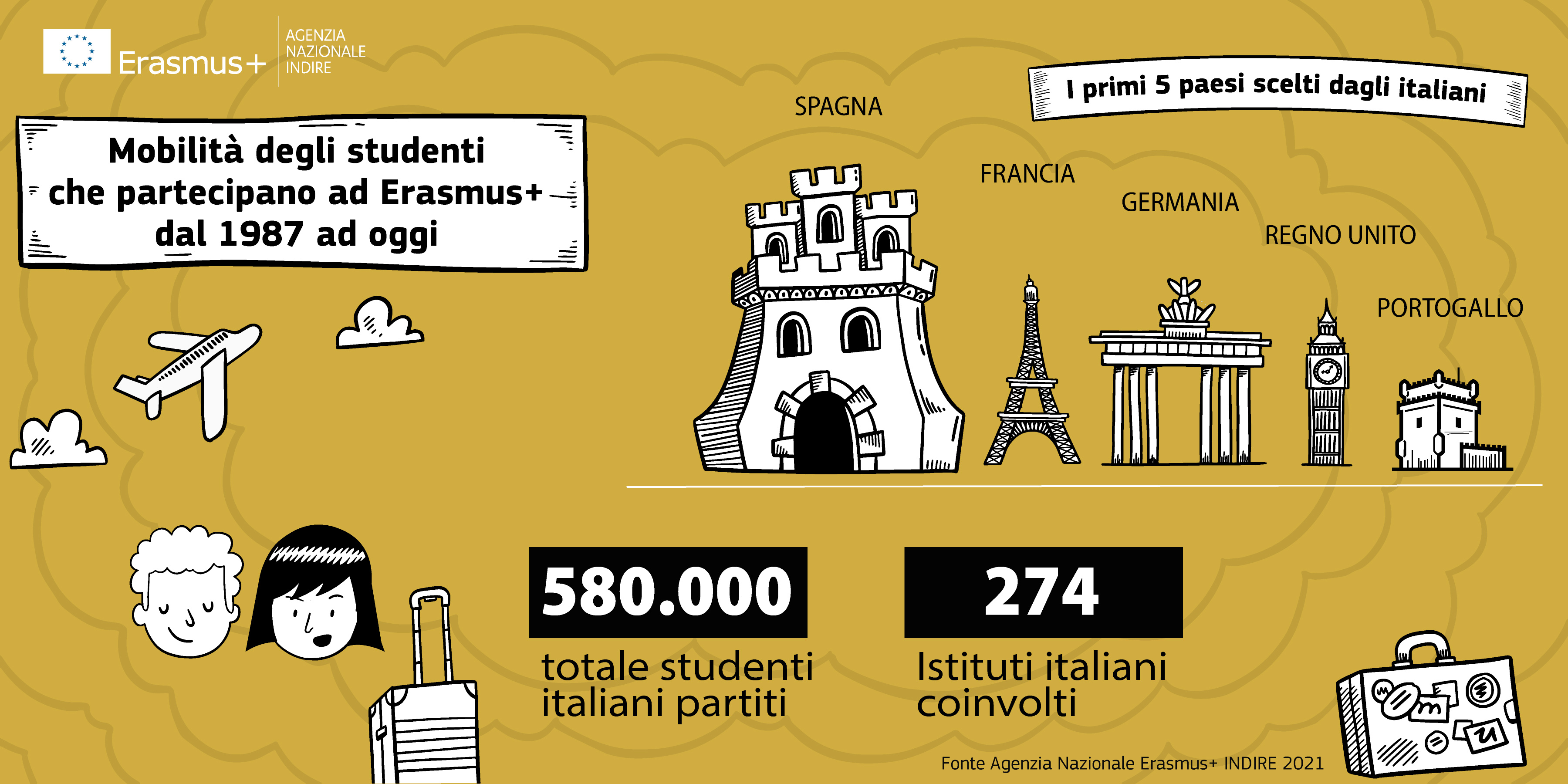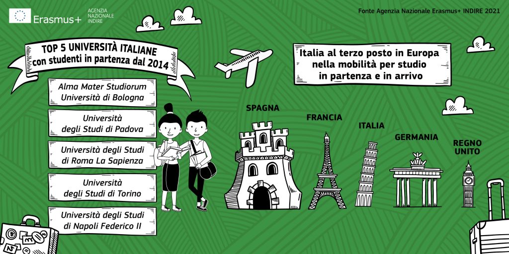 UNIVERSITÀ (mobilità in UE) – Dall’inizio del programma (1987) fino ad oggi, gli studenti universitari italiani complessivamente coinvolti in mobilità per studio o tirocinio sono stati circa 580 mila. Solo negli ultimi 7 anni sono partiti 242 mila studenti italiani. Questo dato ha permesso all’Italia di salire dalla 4° alla 3° posizione (dopo Spagna e Francia) per studenti in partenza in mobilità per studio verso diverse destinazioni europee. Se si guarda all’accoglienza il nostro paese è anche al terzo posto, poco dopo Spagna e Francia, con oltre 162 mila studenti europei che negli ultimi 7 anni hanno scelto l’Italia un periodo di studio.