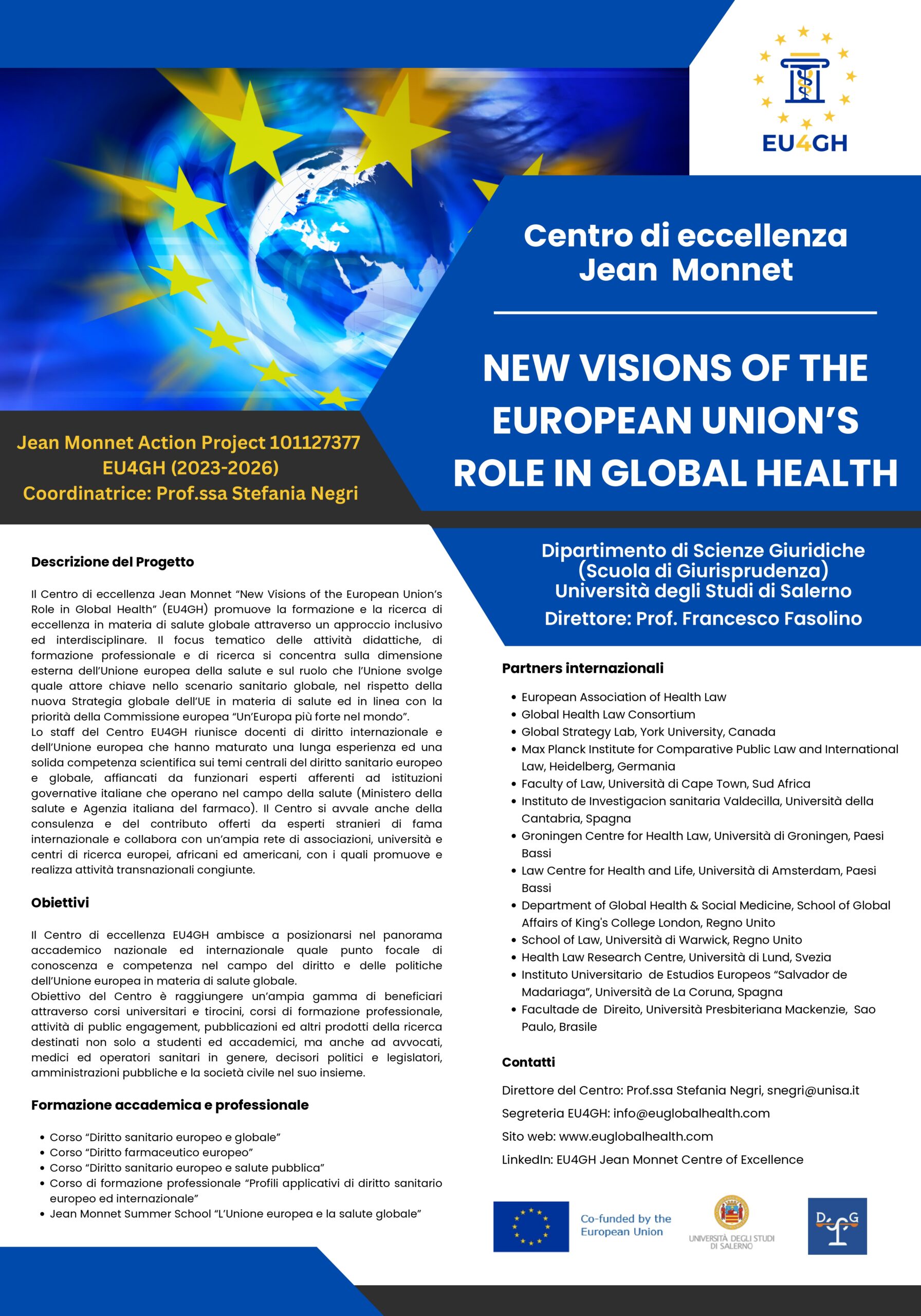 EU4GH “New Visions of the European Union’s Role in Global Health” è un’azione centralizzata Erasmus+ e, in particolare, un Centro di eccellenza Jean Monnet. E’ coordinato dall’Università degli Studi di Salerno e si propone di offrire formazione accademica e professionale post-lauream nonché di sviluppare temi di ricerca sul ruolo dell’Unione Europea quale attore globale nel campo della salute pubblica, con focus specifico sulla nuova EU Global Health Strategy e le relazioni UE-Africa, sulla creazione della European Health Union ed il rafforzato quadro normativo UE in tema di gestione delle emergenze sanitarie di rilevanza internazionale.