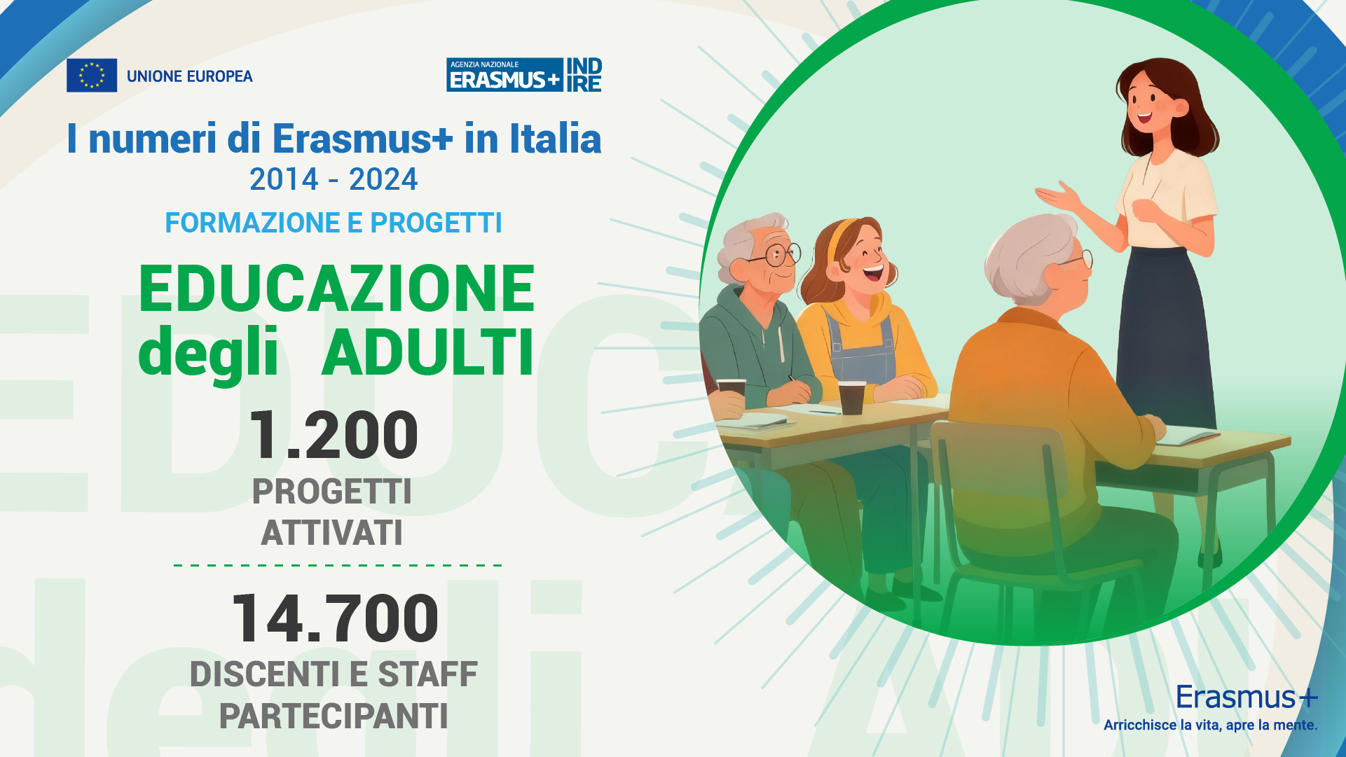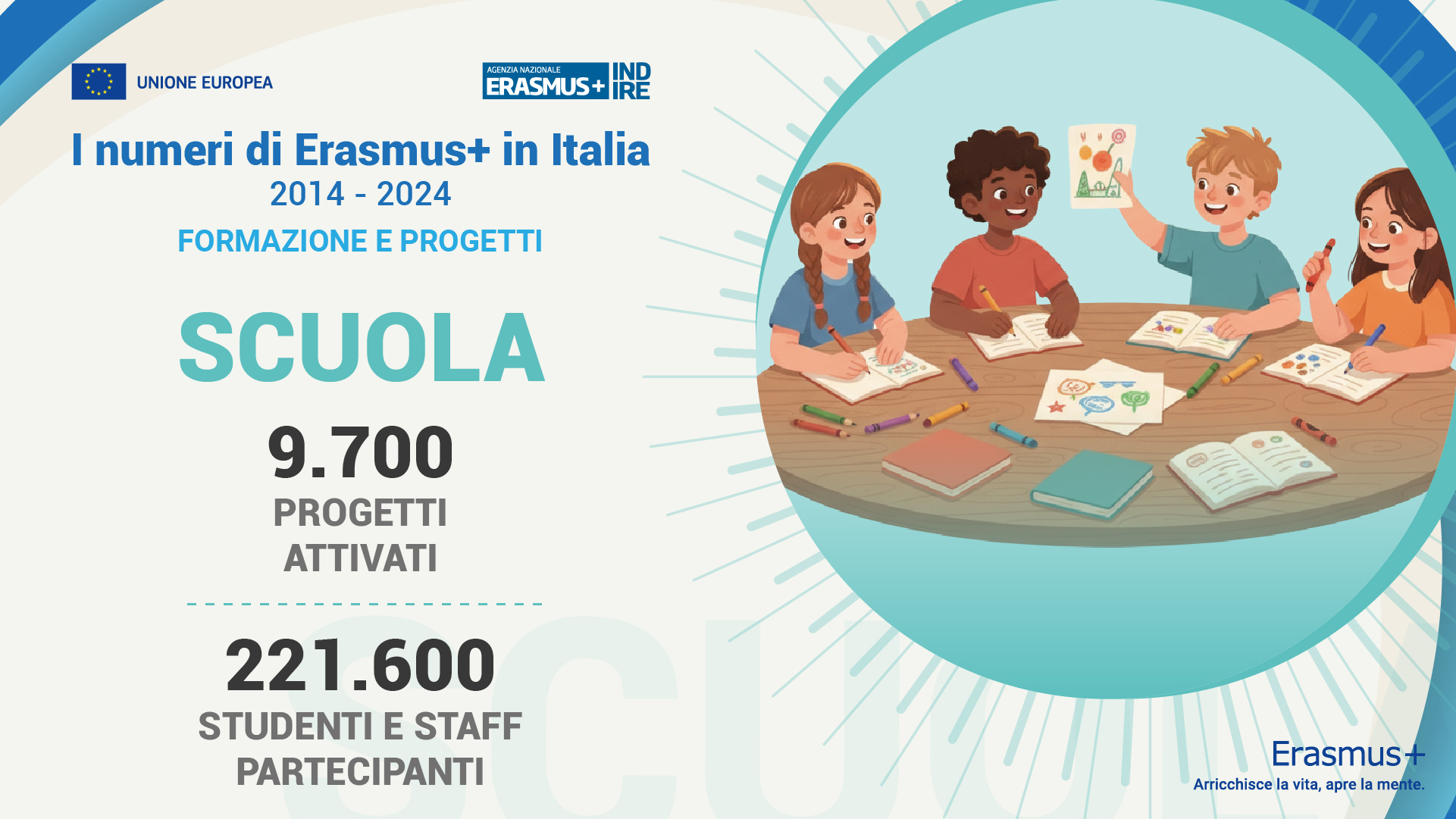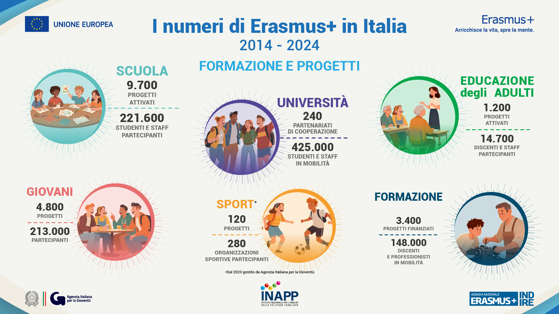 Nel periodo 2014–2024 il Programma Erasmus+ ha prodotto risultati di grande rilievo in Italia in tutti i settori dell’Istruzione scolastica e superiore, della Formazione professionale, della Gioventù, dell’Educazione degli adulti e dello Sport.