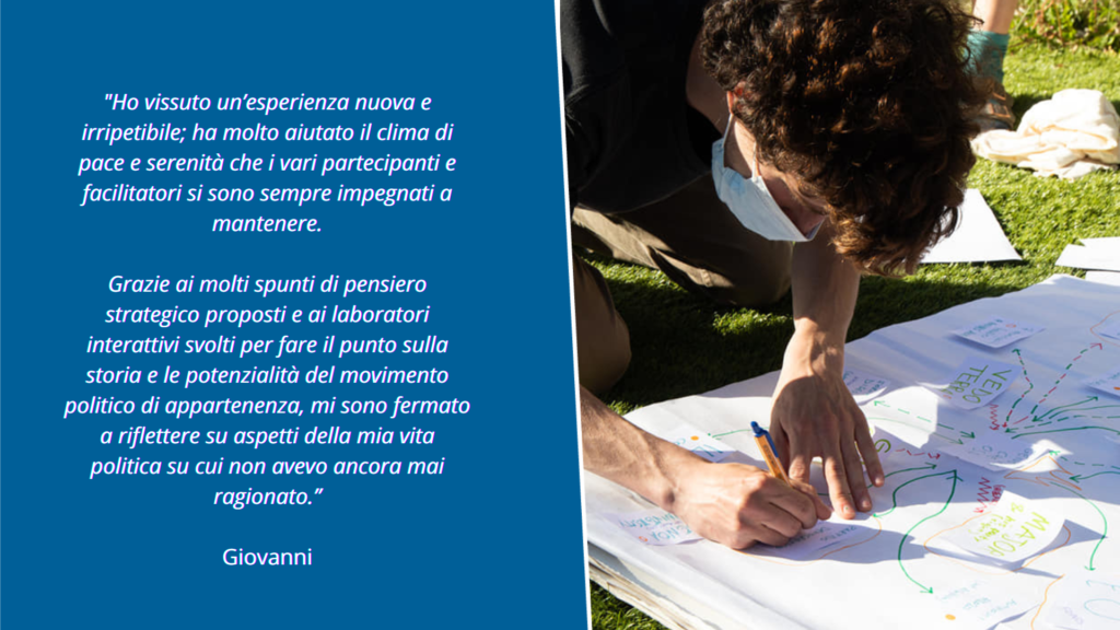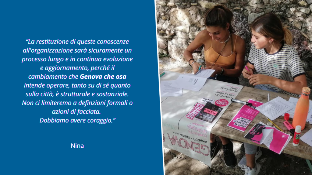 Stefano Gangero: Siamo un’organizzazione non profit, progressista, che si occupa di contrasto alle disuguaglianze e di incentivare la partecipazione democratica a Genova e in Liguria. Abbiamo, ormai dal 2020, un programma interno di formazione non formale tra pari rivolto a giovani per l’attivismo civico e politico, svolto da alcuni nostri e nostre attiviste di staff che (persone salariate, volontari che collaborano strutturalmente con l’organizzazione, ecc.). L’esperienza interessante di questo percorso è che essendo una formazione tra pari succede che alcuni dei giovani che partecipano alla scuola nel ciclo successivo diventano a loro volta delle formatrici o dei formatori.
