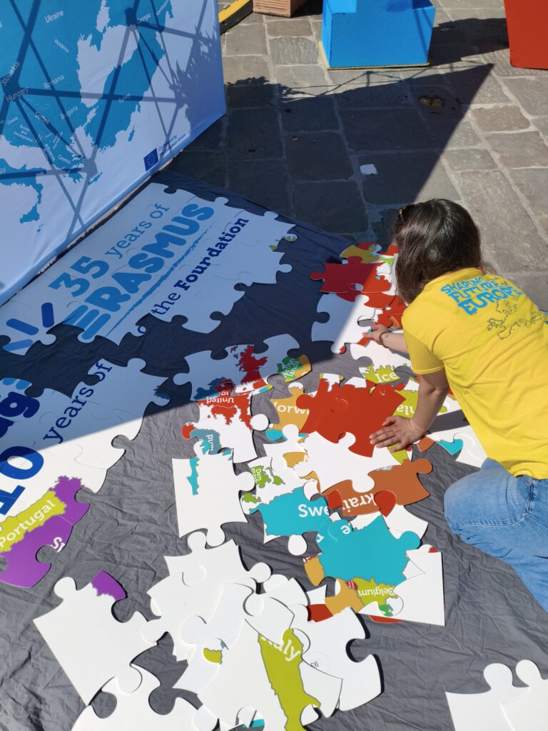 Il momento clou della mattinata ha visto protagonista la vivace iniziativa di garagErasmus, che ha messo al centro dell’attenzione i bambini e il tema dell’impegno civico. Tra le attività più coinvolgenti, “Play with Europe” – un enorme puzzle rappresentante la mappa dell’Europa – che ha divertito i più piccoli. Mentre assemblavano i tasselli colorati, i bambini miglioravano così le proprie conoscenze in materia di geografia, e scoprivano la bellezza e la diversità del continente europeo. Inoltre, volontari di garagErasmus hanno mantenuto vivo l’interesse ponendo domande coinvolgenti e adatte ad ogni livello di età, come “Sapresti dirmi in quale paese le persone parlano lo Spagnolo?”, o “Potresti indicarmi un’isola nella mappa?”. Ogni risposta corretta è stata premiata con un piccolo regalo, stimolando così gioia, curiosità e apprendimento.